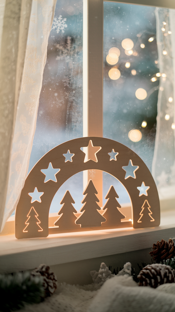 Zum Schluss braucht dein Werk noch einen sicheren Stand. Dafür kannst du einen stabilen Holzfuß oder zwei kleine Holzleisten unter den Bogen kleben. So steht er stabil auf der Fensterbank und strahlt nach draußen. Wenn du magst, kannst du auch noch kleine Figuren, Mini-Bäume oder Streuschnee davor platzieren – so erzählst du eine kleine Weihnachtsgeschichte direkt im Fenster.