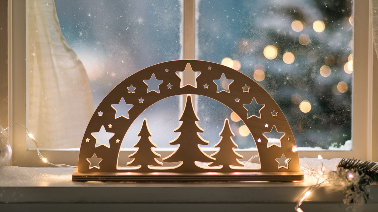 Zum Schluss braucht dein Werk noch einen sicheren Stand. Dafür kannst du einen stabilen Holzfuß oder zwei kleine Holzleisten unter den Bogen kleben. So steht er stabil auf der Fensterbank und strahlt nach draußen. Wenn du magst, kannst du auch noch kleine Figuren, Mini-Bäume oder Streuschnee davor platzieren – so erzählst du eine kleine Weihnachtsgeschichte direkt im Fenster.