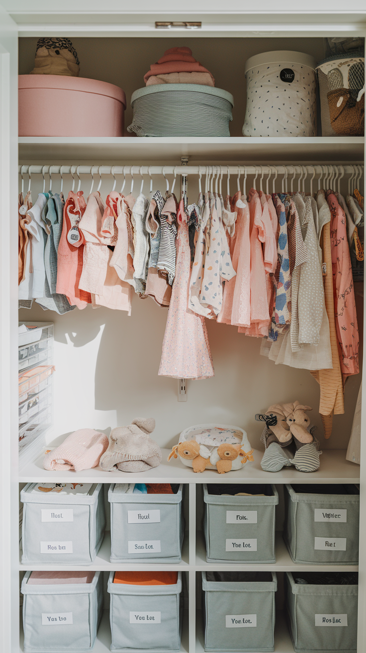 Sortiere regelmäßig und lagere die Kleidung nach Größe. Kleine Boxen mit Etiketten helfen enorm. Alles, was zu klein ist, kommt direkt in eine Erinnerungs- oder Spendenbox.