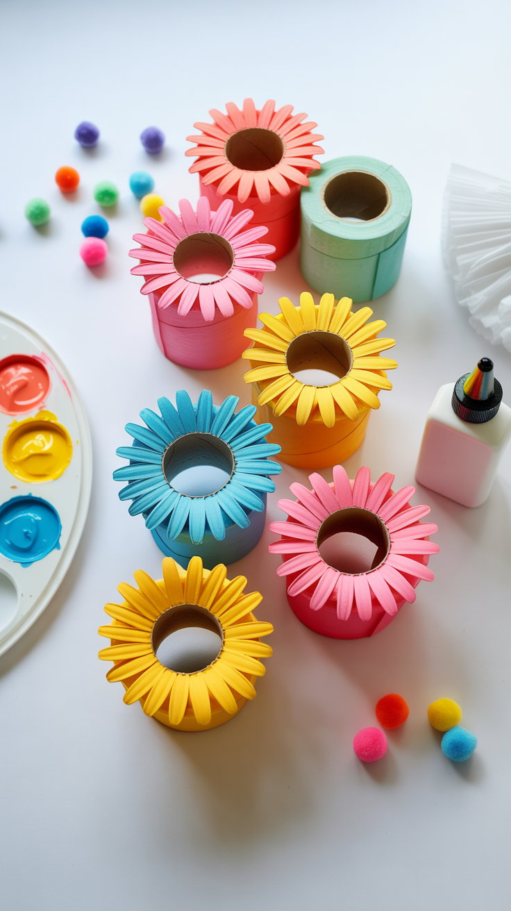 🧺 Materialien: Leere Papierrollen, Schere, Bastelkleber, Farbe, Pompons
