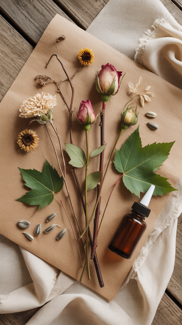 🧺 Materialien: Blätter, Zweige, Blütenreste, Samen, Karton, Bastelkleber