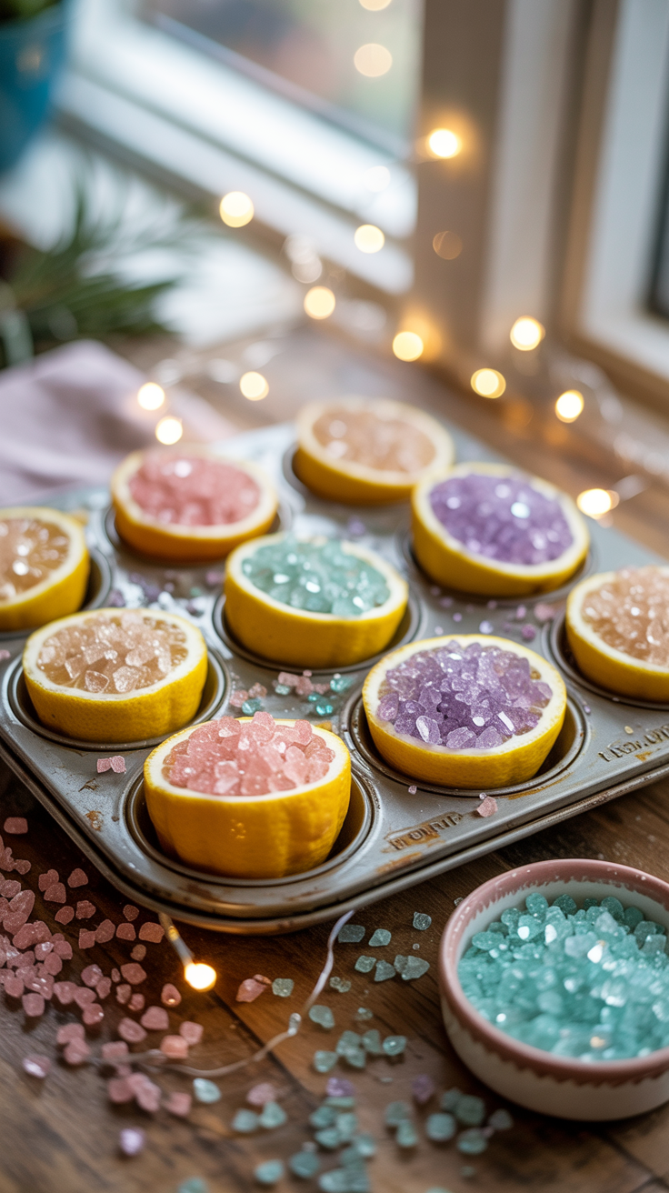 Crystal Candy Geodes sind essbare „Kristallhöhlen“, die durch einen einfachen Kristallisationsprozess entstehen. Statt echter Gesteinshohlräume nutzt du hier halbierte Zitronen als natürliche Schalen.