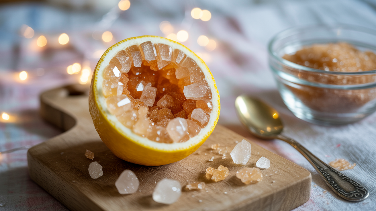 Aus einer ganz normalen Zitrone kann ein kleines Wunder entstehen. Was zunächst wie eine einfache Fruchthälfte aussieht, verwandelt sich über Nacht in eine funkelnde, essbare Geode.