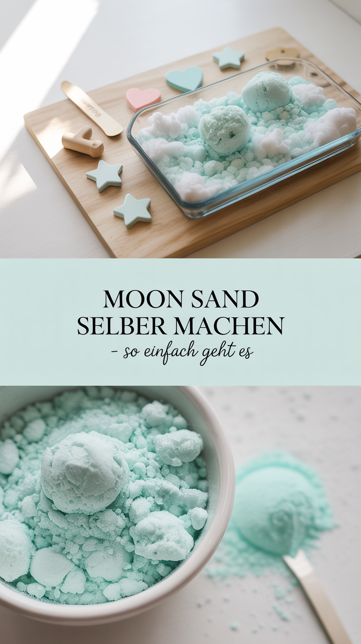 Moon Sand ist eine dieser Ideen die sofort Leichtigkeit in den Tag bringen. Die Masse ist schnell gemacht und fühlt sich für Kinder angenehm an. Sie lädt zum ruhigen Spielen ein und schafft Momente in denen du einmal tief durchatmen kannst. Ob als neutraler Sand als bunter Mix oder als essbare Variante. Moon Sand passt zu jeder Jahreszeit und zu jedem Alter. Mit ein paar Zutaten entsteht ein kreativer Spielraum der lange begeistert.
