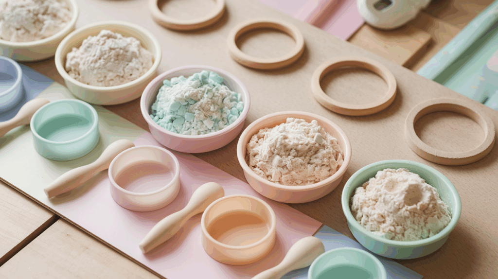 Für kleine Entdecker lohnt sich eine essbare Variante. Diese Version kannst du sorgenfrei anbieten weil alle Zutaten unbedenklich sind. Du verwendest einfach Mehl und Kokosöl oder Mehl und Wasser. Die Masse wird etwas bröseliger aber immer noch gut formbar. Dein Kind kann damit drücken und krümeln ohne dass du dir Sorgen machen musst.