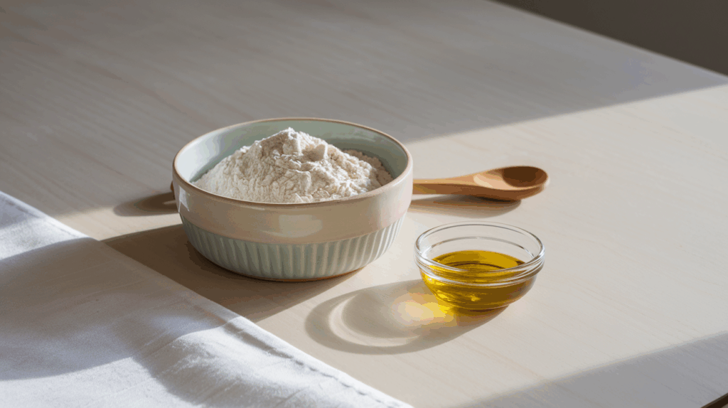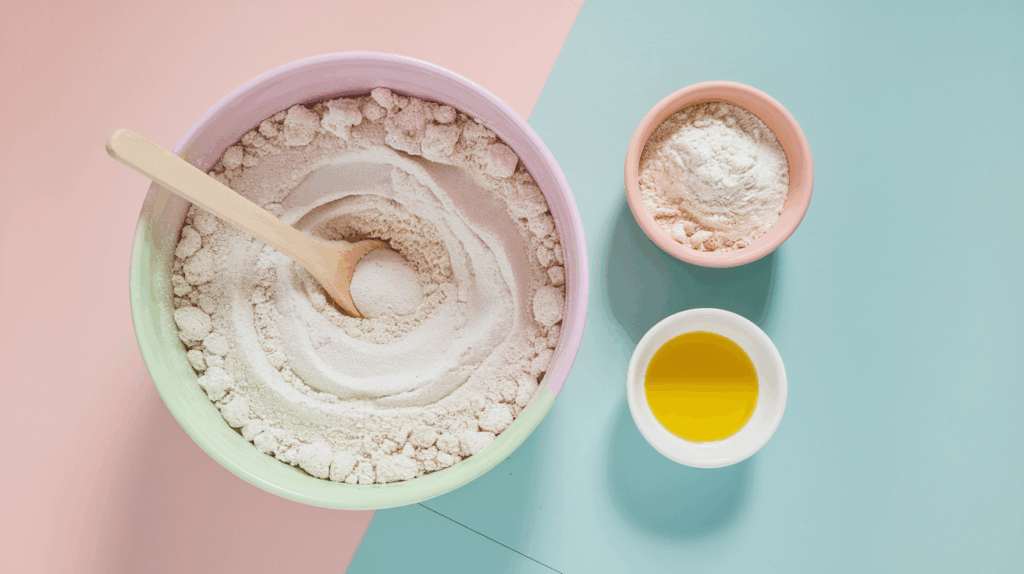 Du brauchst Mehl und Öl. Beides sorgt dafür dass sich die Masse weich anfühlt und gut zusammenhält. Ideal ist Babyöl oder ein mildes Speiseöl. Die Mischung fühlt sich angenehm an und riecht neutral. Wenn du möchtest kannst du Lebensmittelfarbe Pulverfarben oder Aromen hinzufügen.