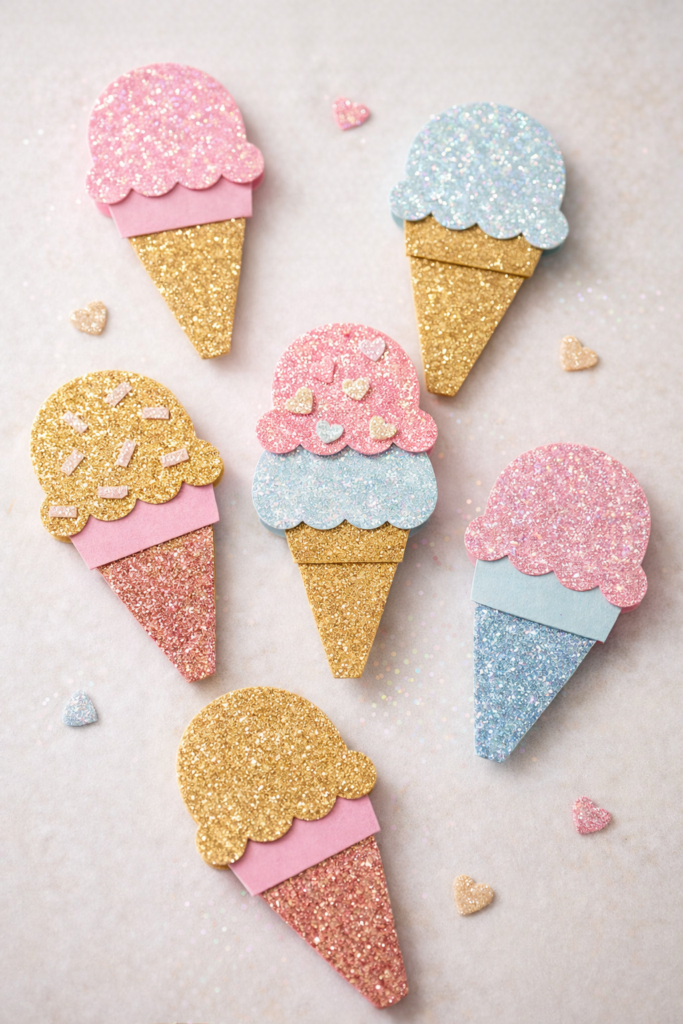 Schneide eine Eisform aus Tonpapier aus. Trage dann Kleber auf einzelne Bereiche auf und streue Glitzer darüber. Du kannst verschiedene Farben kombinieren oder nur einzelne Highlights setzen. Nach dem Trocknen wirkt das Eis wie ein kleines Kunstwerk und eignet sich perfekt als Deko.
