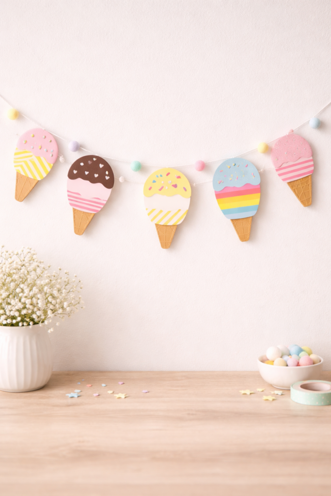 Schneide mehrere kleine Eisformen aus und gestalte sie individuell. Danach werden sie mit etwas Abstand auf eine Schnur geklebt oder aufgefädelt. Die fertige Girlande kannst du im Kinderzimmer oder auf dem Balkon aufhängen. Sie sorgt sofort für Sommerstimmung.