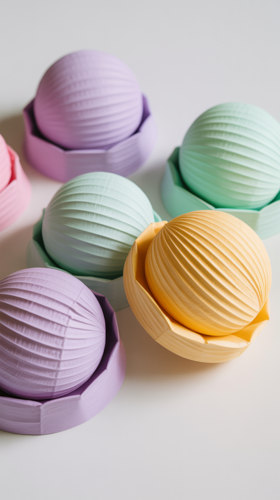 Schneide mehrere gleich große Papierstreifen aus und falte sie wie eine Ziehharmonika. Diese Streifen werden anschließend kreisförmig zusammengeklebt, sodass eine runde, leicht gewölbte Eisform entsteht. Die Kugel wird dann auf eine einfache Waffel aus Pappe geklebt. Durch die Faltung entsteht ein schöner 3D-Effekt, der das Eis besonders macht.