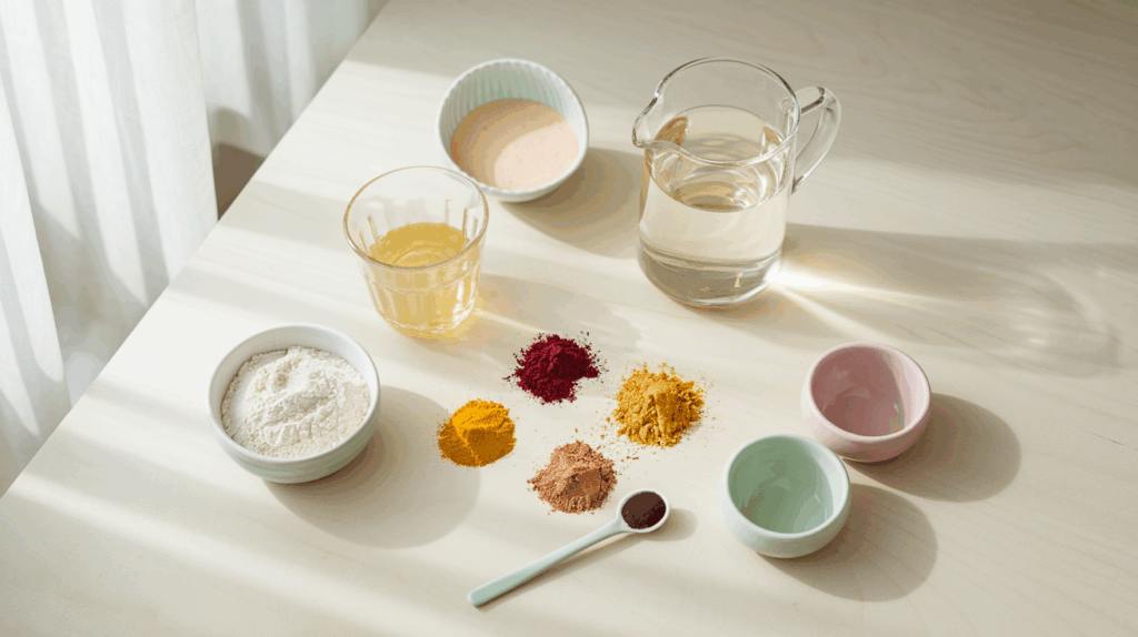 | Natürliche Farbstoffe | Pflanzenpulver, Lebensmittelfarben oder Säfte für bunte Töne |