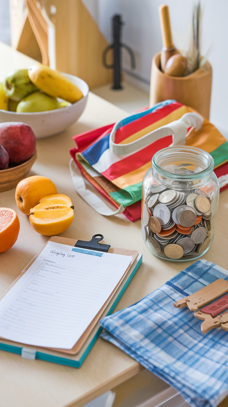 Plane Mahlzeiten für die Woche. Schreibe eine Liste und bleib dabei. Kinder lieben es, wenn sie beim Einkaufen helfen dürfen. Lass sie Kleinigkeiten abhaken oder Obst aussuchen. So wird der Einkauf zum Spiel und du vermeidest teure Spontankäufe.