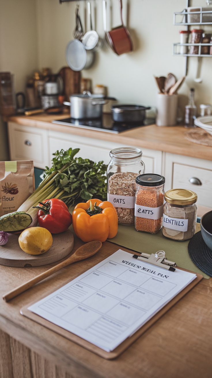 Plane eure Mahlzeiten für die Woche. Schreib die Zutaten auf eine Liste und kaufe alles in einem großen Einkauf. Das spart Zeit, Nerven und Geld. Kinder können beim Planen mitreden und Lieblingsgerichte vorschlagen.