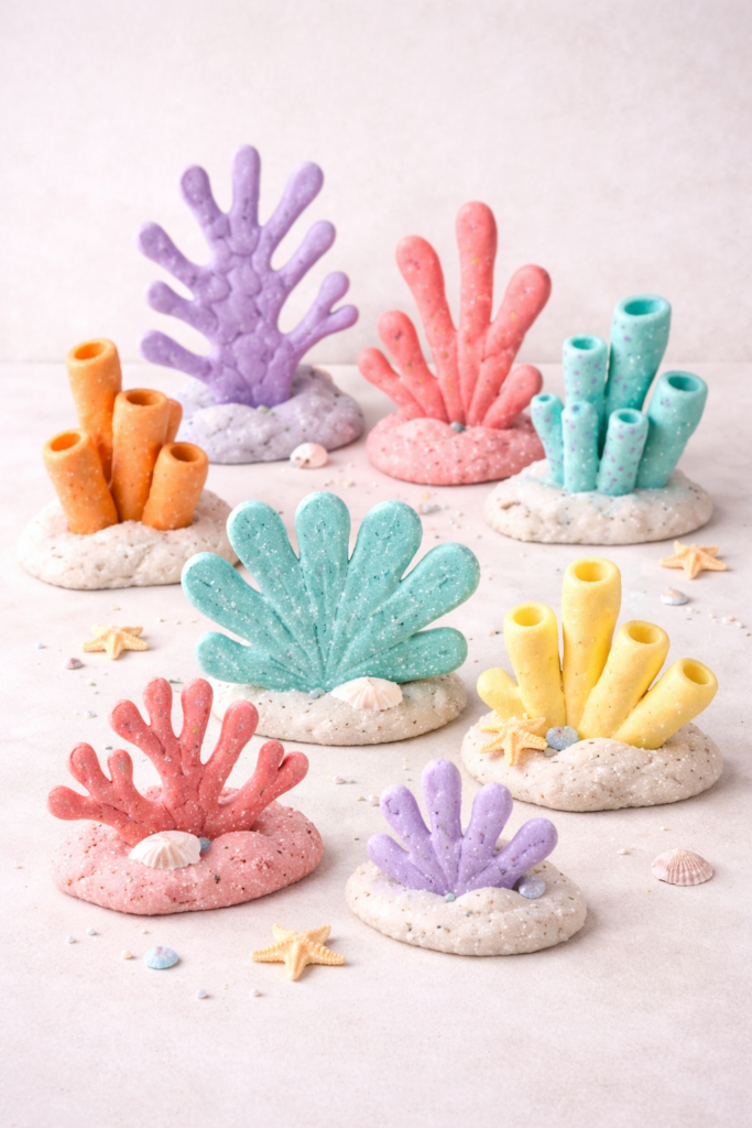 Mit Salzteig kannst du echte Reliefstrukturen bauen. Die Haptik macht Kindern Spaß. Du kombinierst Riffkörper und Muscheln. So entsteht ein lebendiges Dekostück. Das Material ist günstig und frei von Chemie. Nach dem Backen kannst du es bunt bemalen. Dein Kind lernt dabei Formen zu erforschen.