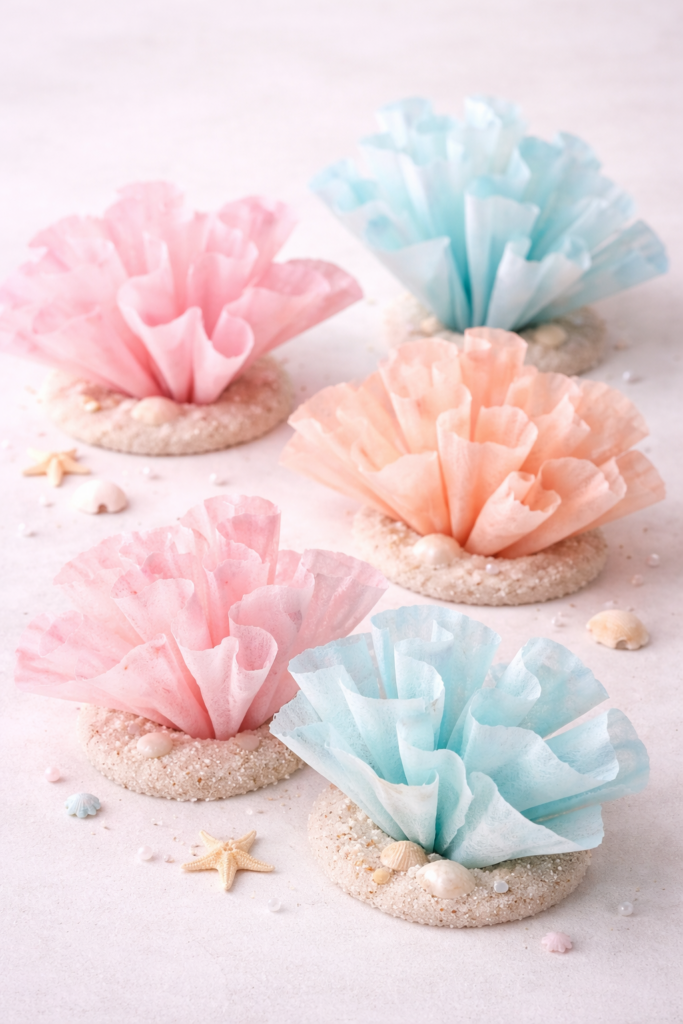 Kaffeefilter bieten feine, wellige Formen. Das ergibt filigrane Korallenäste. Du färbst sie mit Aquarell oder Kaffee. So erhältst du zarte Farbverläufe. Leichte Filter lassen sich gut biegen. Das Basteln schult Fingerfertigkeit. Schon in kurzer Zeit entsteht ein zartes Kunstwerk.
