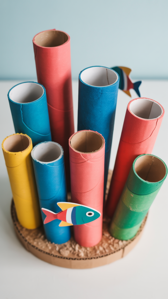 Leere Rollen sind optimal für Röhrenkorallen. Du schneidest sie schmal und malst bunt. Das Material hat festen Stand. Kombiniere verschiedene Höhen zu einem echten Riff. Das Recyclingprojekt spricht Umweltthemen an. Dein Kind lernt, Bauabfälle sinnvoll zu nutzen.