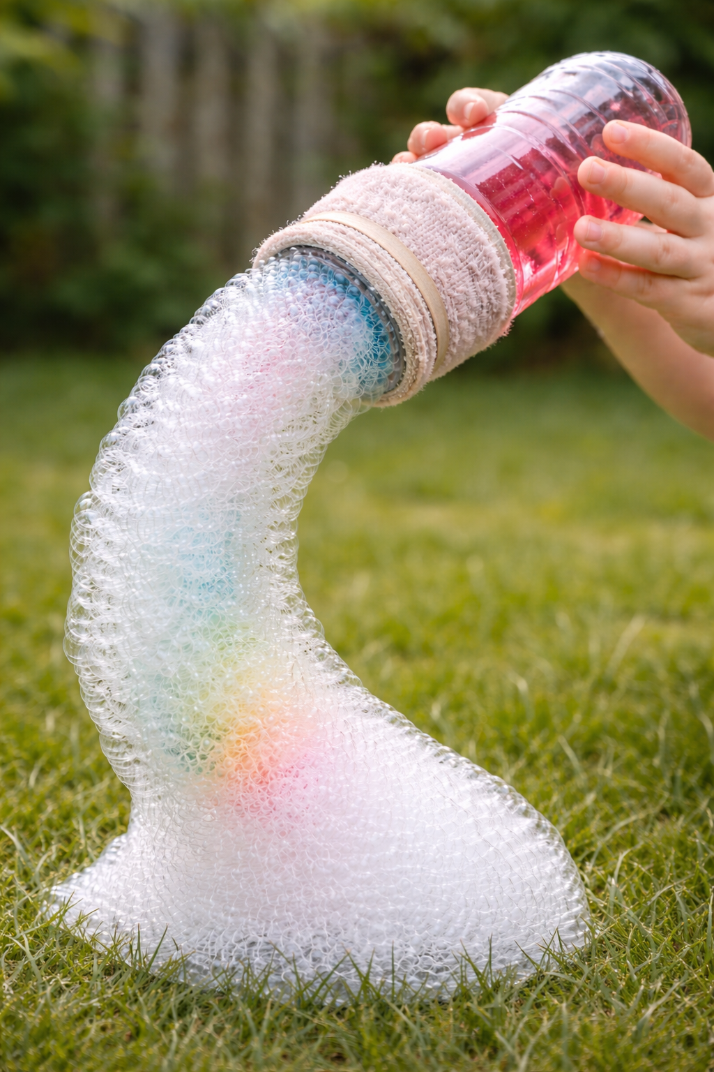 Dazu kommt die Bewegung. Dieses Experiment ist nicht still und ruhig, sondern aktiv und lebendig. Tief einatmen, kräftig ausatmen, lachen, staunen und direkt das Ergebnis sehen – das macht einfach Spaß. Wenn dann noch Farbe ins Spiel kommt und sich eine Regenbogen-Blasen-Schlange durch die Luft schlängelt, wird aus einem einfachen Puste-Experiment ein echtes Highlight im Garten oder auf dem Balkon. Genau diese Mischung aus Kontrolle, Überraschung und sichtbarem Wow-Effekt macht die Giant Bubble Snake für Kinder so faszinierend.