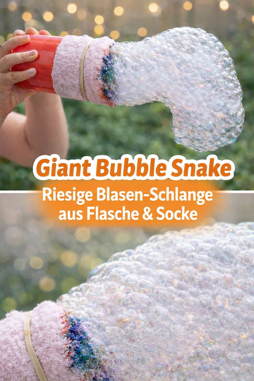 Eine Giant Bubble Snake ist eine lange, zusammenhängende Kette aus vielen kleinen Seifenblasen, die beim Hineinpusten durch eine mit Stoff bespannte Flasche entsteht. Statt einzelner Blasen formt sich eine Art weicher Blasen-Schlauch, der sich nach vorne schiebt und immer weiter verlängert. Er sieht ein wenig aus wie eine Schlange aus Schaum, die sich durch die Luft bewegt.