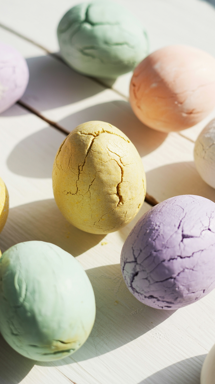 Eine klassische Idee, bei der Kinder den Teig selbst kneten. Sie erleben den Zusammenhalt der Zutaten und formen Eier mit den Händen. Das Ergebnis trocknet an der Luft und kann später bemalt werden. So lernt dein Kind ganz spielerisch Grundformen kennen und fördert seine Kreativität.