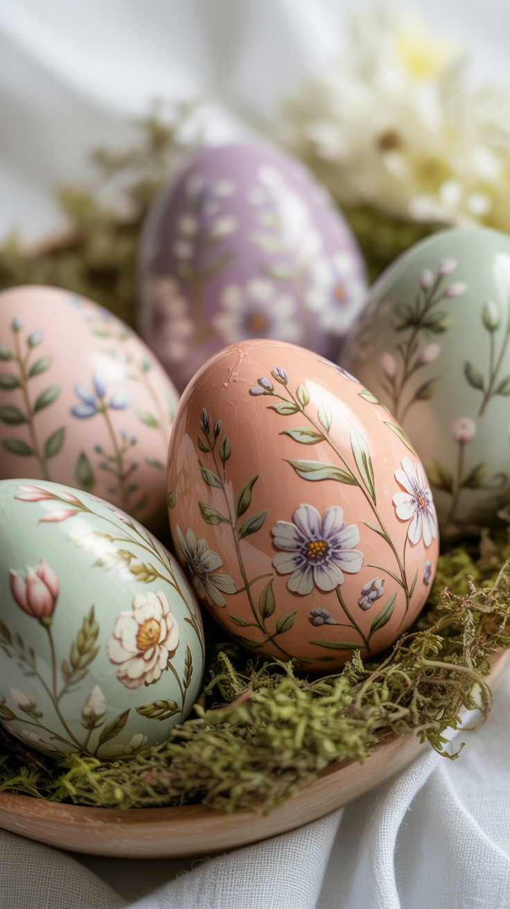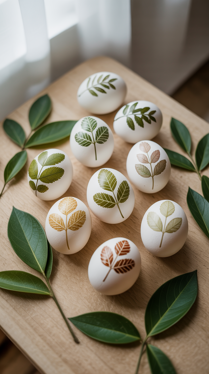 Natürliche Muster wirken zart und einzigartig. Kinder legen kleine Blätter auf die Eioberfläche und rollen die Farbe darüber. Anschließend lösen sie die Blätter ab und stolzieren ihre Kunst.