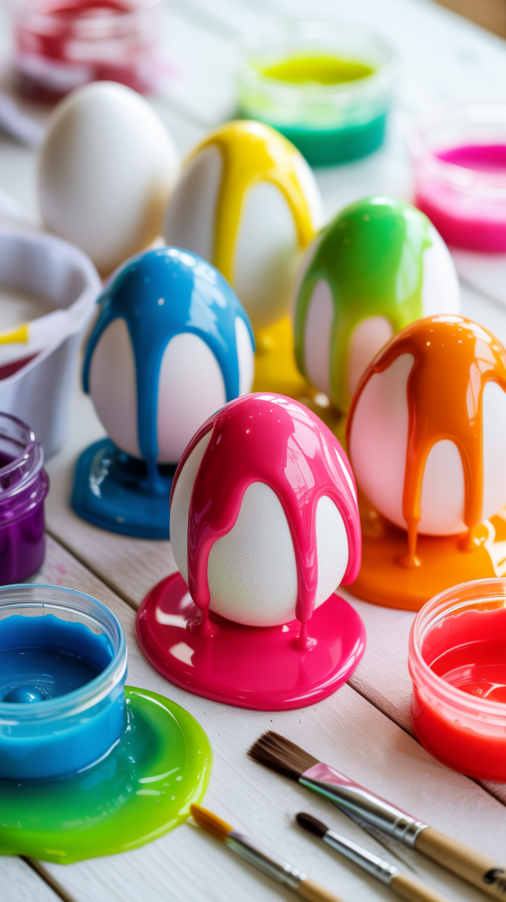 Alte Wachsmalblöcke schmelzen Kinder auf Eiern. Mit Föhn oder Heißluft entstehen bunte Tropfen. So erhält jedes Ei ein einzigartiges Muster durch fließende Farbe.