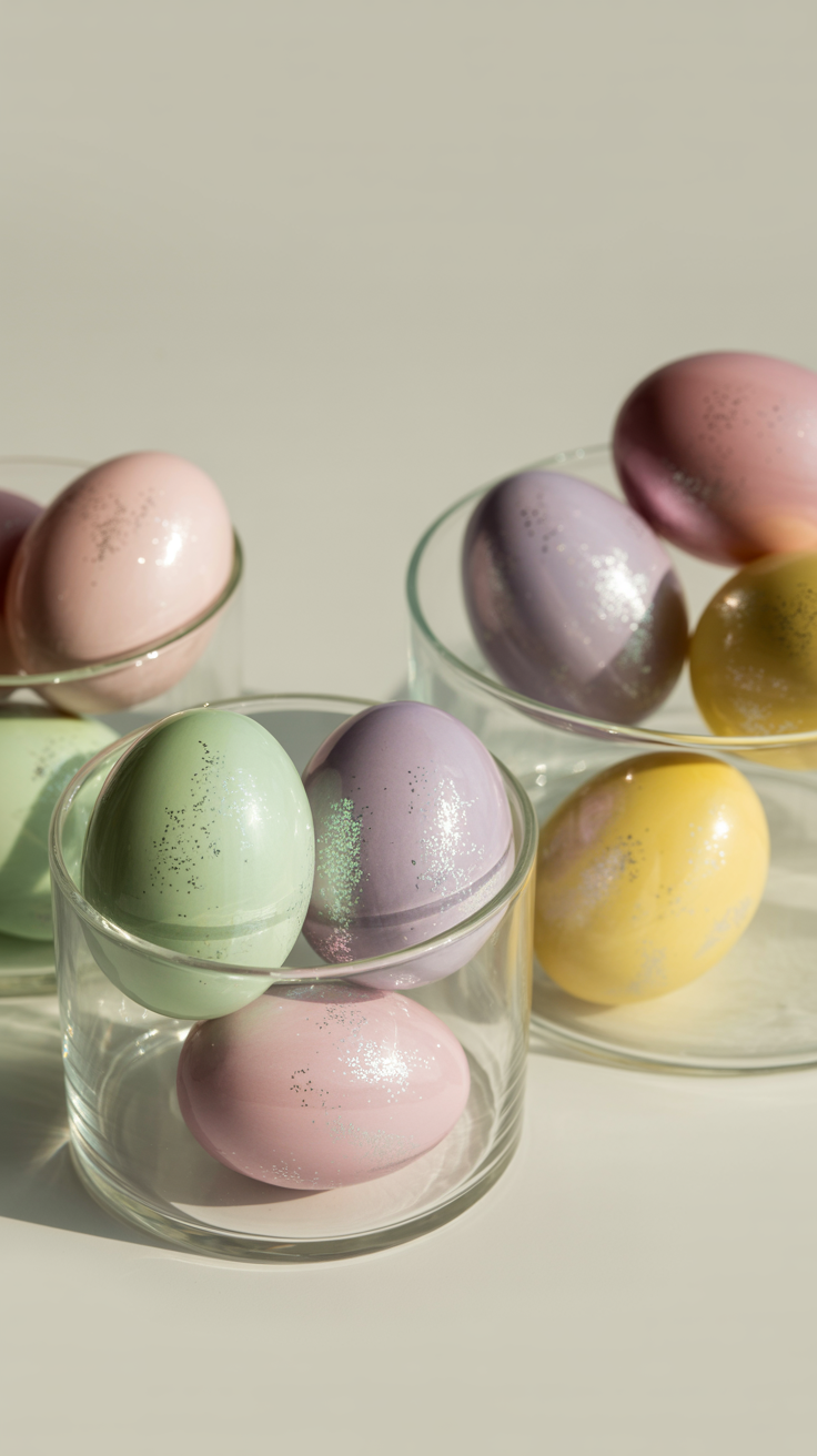 Einfach und wirkungsvoll: Kinder füllen Gläser mit Glitzer und legen Eier hinein. Beim Schütteln entstehen funkelnde Oberflächen. Die Gläser werden nach dem Trocknen zum Blickfang.