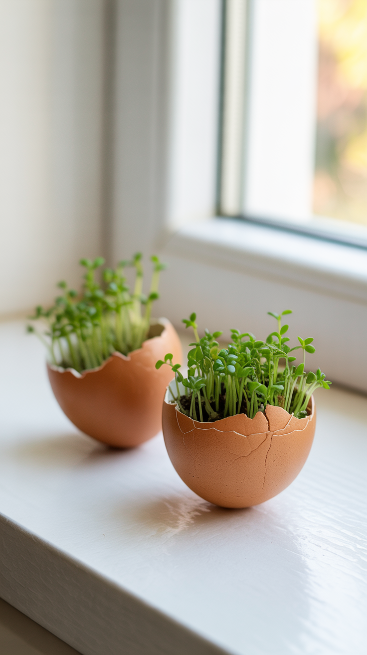 Hier wächst Kresse in halben Eierschalen. Kinder schaufeln Erde hinein und säen Kressesamen. Schon nach wenigen Tagen sprießen grüne Spitzen. Diese Idee verbindet Basteln mit Gartenspaß.