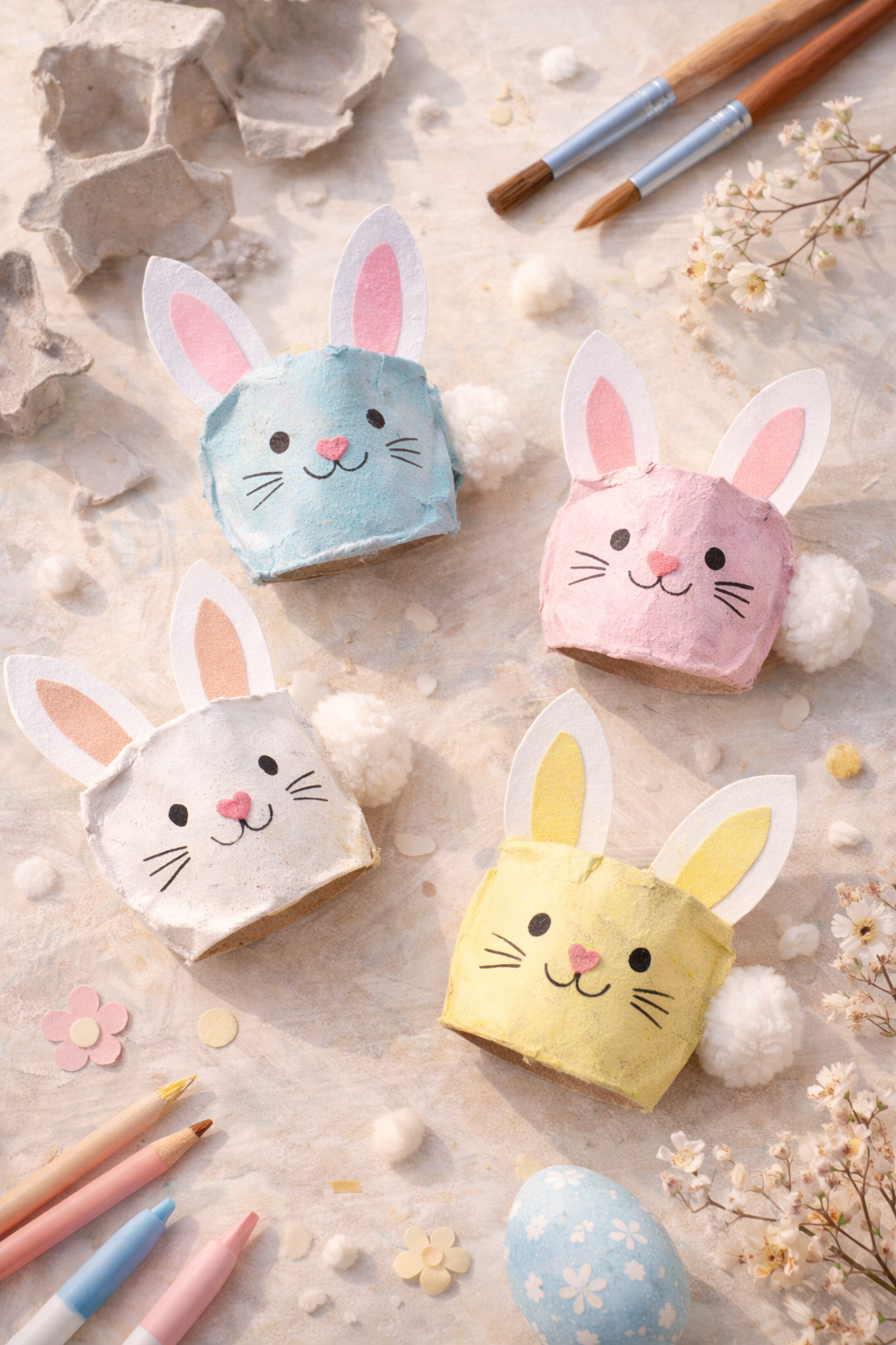Eierkartons sind perfekte Upcycling-Materialien. Damit bastelst du ganz schnell kleine Hasenköpfe, die als Deko oder Spielfiguren dienen.