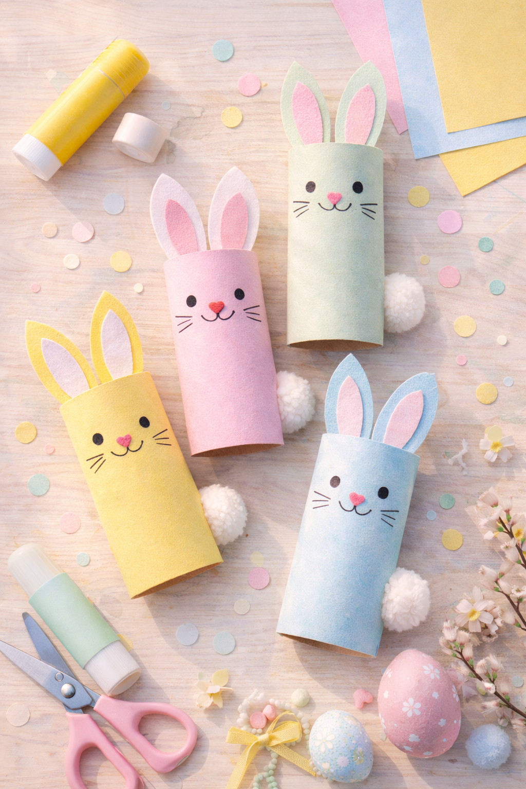 Diese Bastelidee ist perfekt für kleine Kinderhände: schnell, einfach und nachhaltig! Du verwandelst leere Klopapierrollen in süße Hasenfiguren – ideal zum Spielen oder als Tischdeko für Ostern.