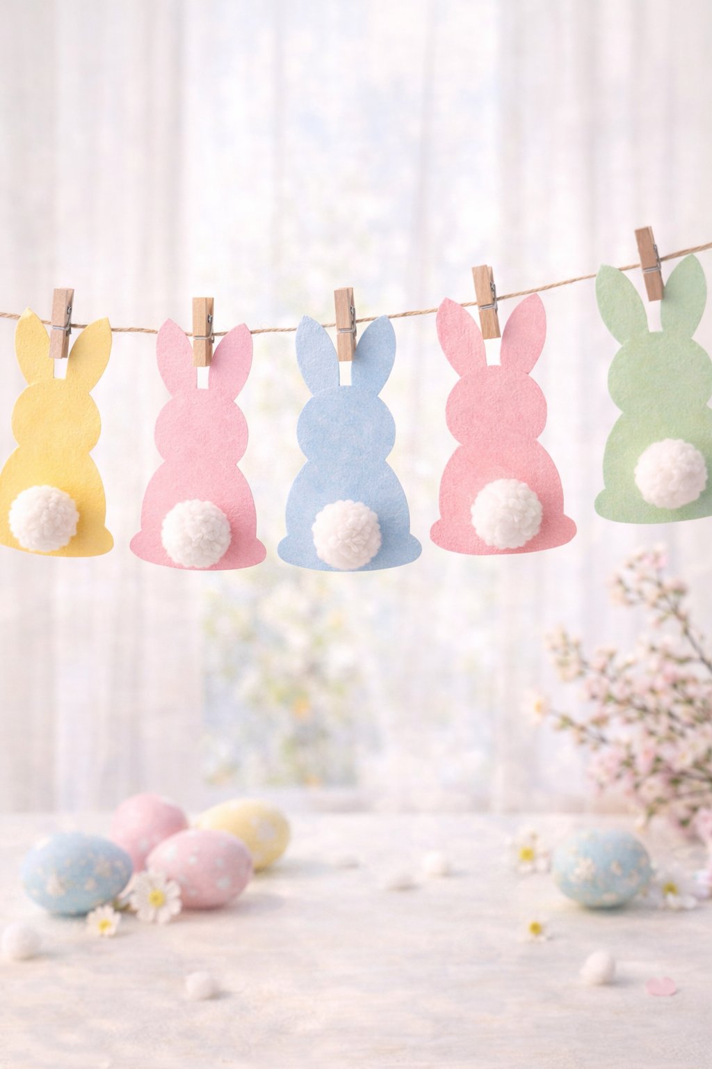 Eine Hasen-Girlande über dem Fenster, Eierkarton-Hasen auf dem Regal oder Filzfiguren auf dem Tisch schaffen eine warme, festliche Atmosphäre.