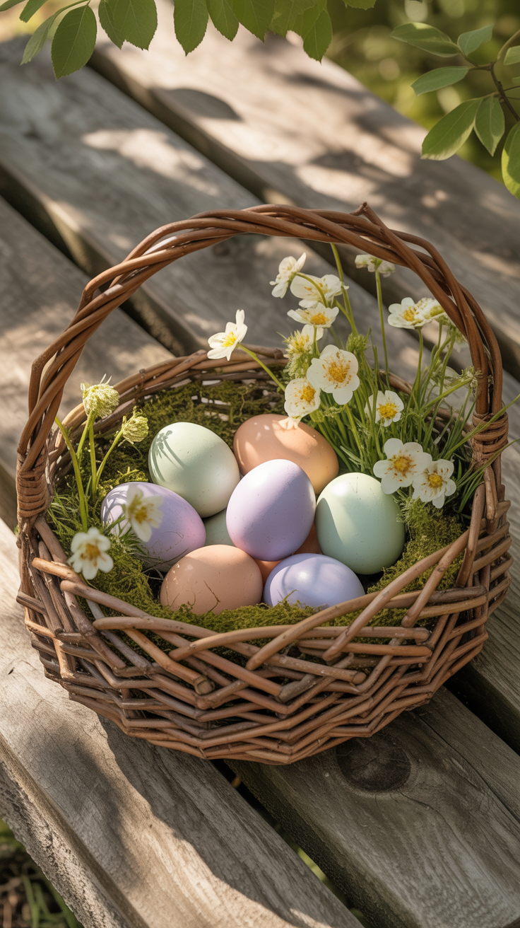 Dieses Naturkörbchen ist besonders für draußen schön. Es sieht aus, als hätte der Osterhase es selbst gebaut – ideal für eine natürliche Tischdeko oder als Geschenk.