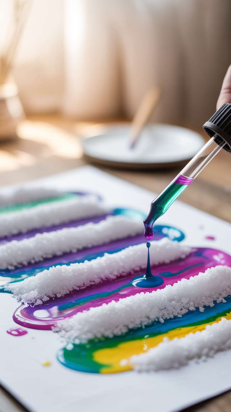 Jetzt kommt der spannendste Teil. Tauche den Pinsel oder die Pipette in die Farbe und berühre vorsichtig das Salz. Die Farbe zieht sich von selbst entlang der Salzkörner und verteilt sich langsam.