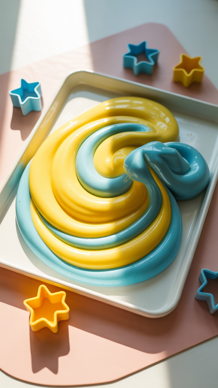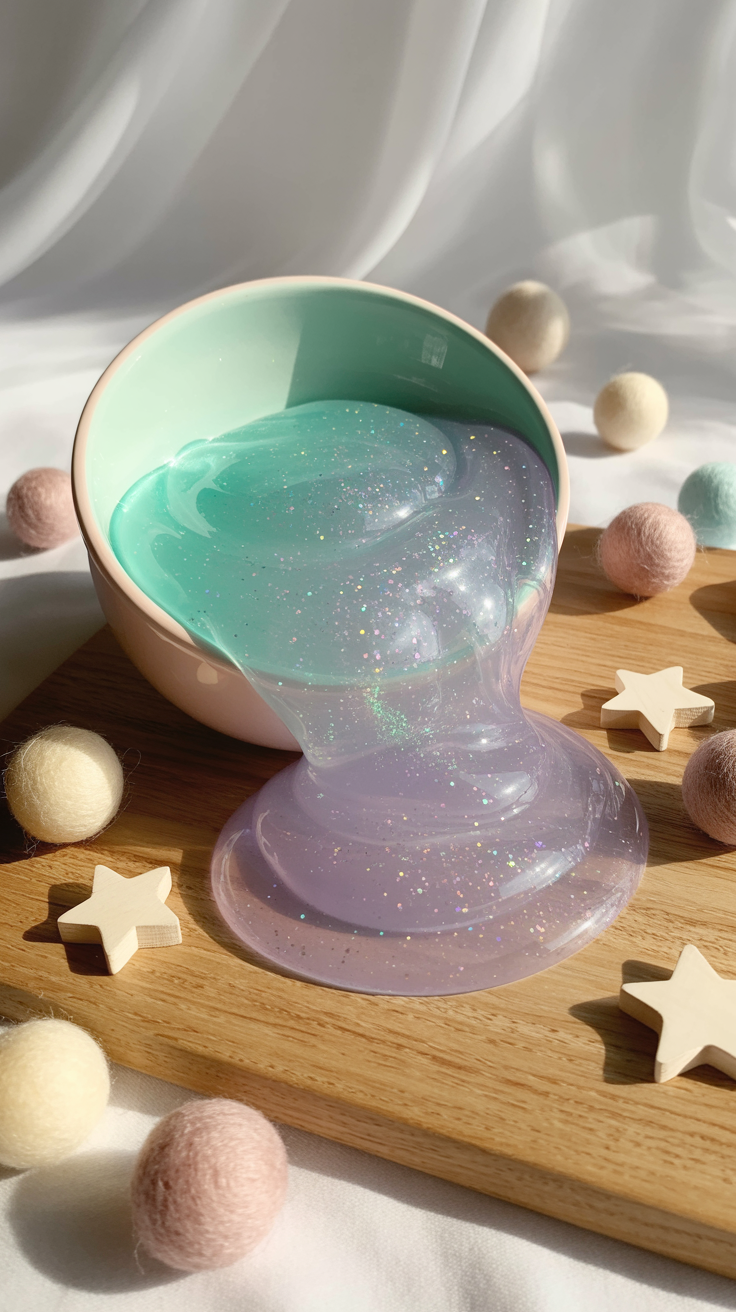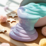 Diese DIY-Spielmasse hat eine sehr weiche, fast flüssige Konsistenz – aber nicht so flüssig wie Wasser. Sie läuft langsam, fast hypnotisch, ohne dabei zu kleben. Kinder können sie anheben, durch die Finger laufen lassen, auf Tellern verteilen oder auf einer schrägen Fläche fließen lassen. Die Bewegung erinnert ein bisschen an Lava – oder an dicke Sirupstreifen auf dem Frühstücksteller.