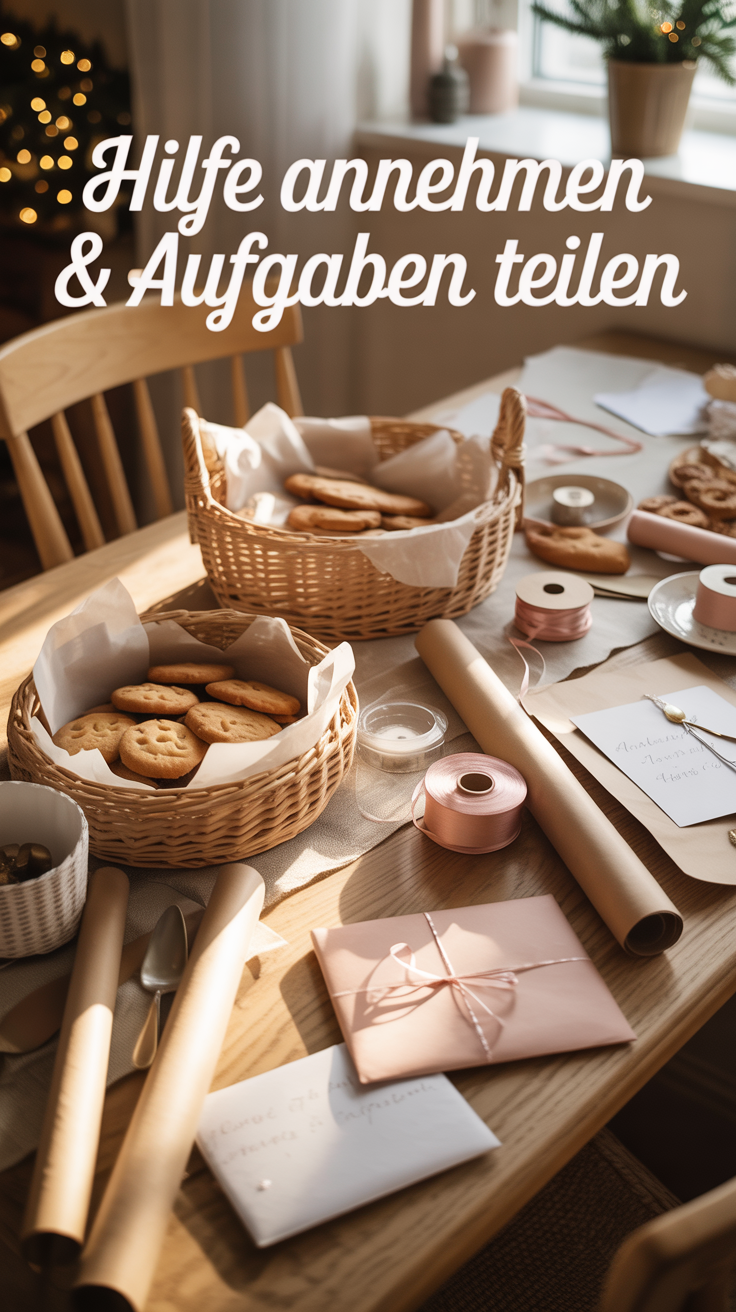 Wenn du merkst, dass es zu viel wird, bitte um Hilfe. Dein Partner kann Geschenke einpacken, die Kinder dürfen beim Aufräumen helfen. Oma freut sich vielleicht, Plätzchen mit den Enkeln zu backen. Jeder kleine Beitrag zählt.